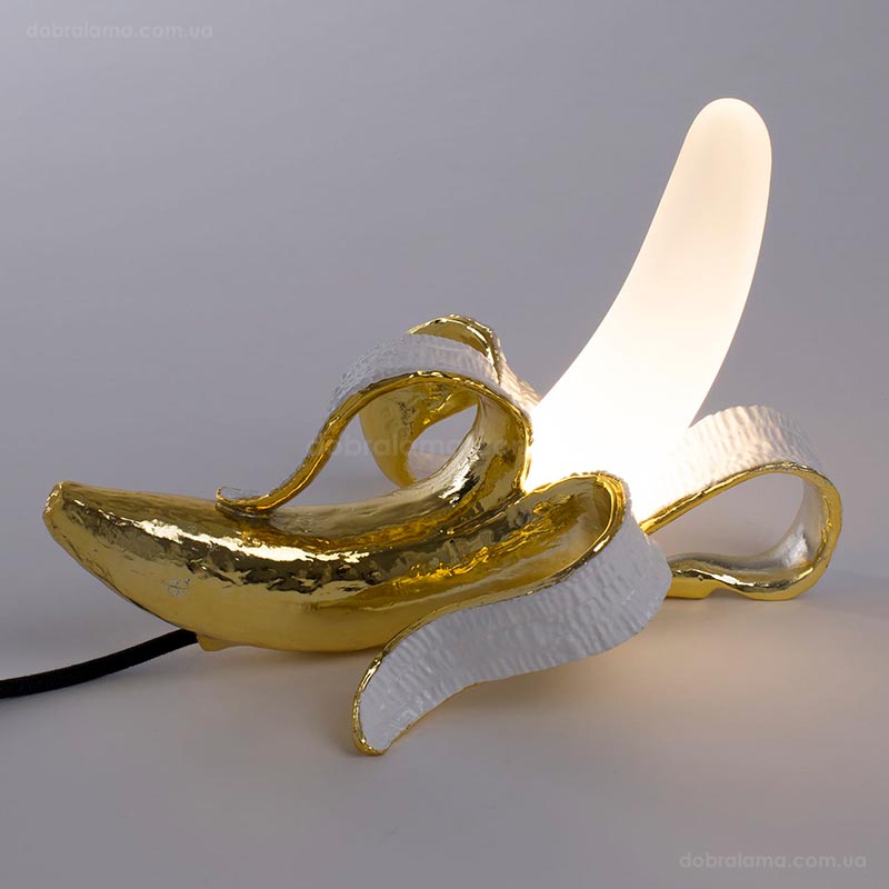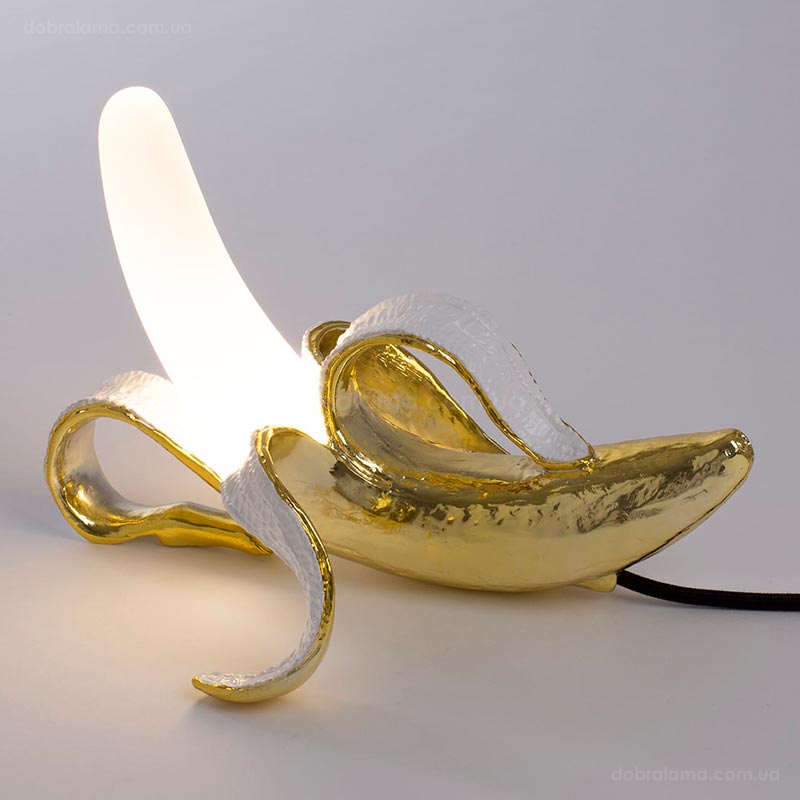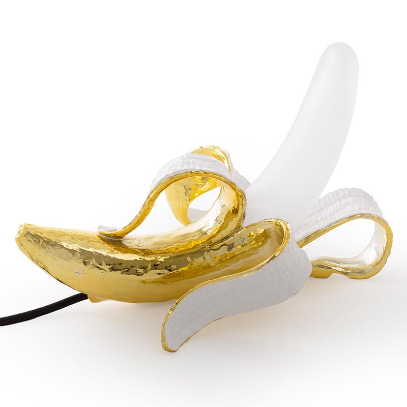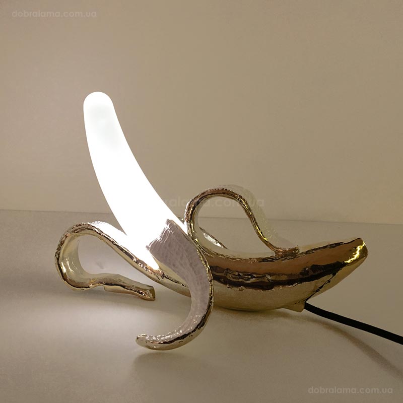 Лампа, виконана у формі стиглого банана, демонструє чудову увагу до деталей та точність кольору. Розкішне оздоблення бананової шкірки чудово контрастує з білою м'якоттю плода, посилюючи її візуальну привабливість. Шкірка золотистого кольору виготовлена з полімеру. А власне освітлювальна частина, м'якоть продукту, виготовлена з матового скла.