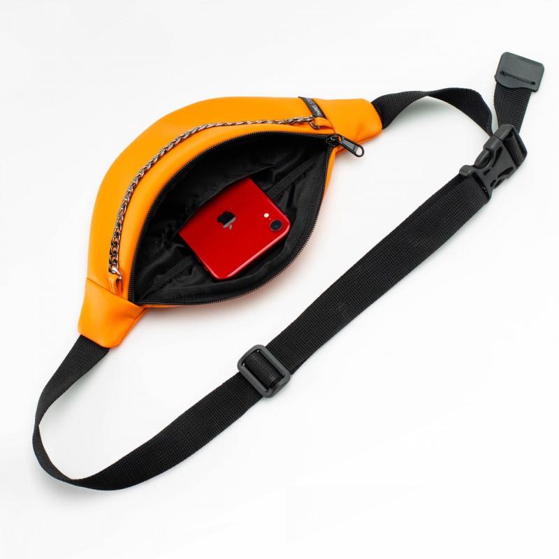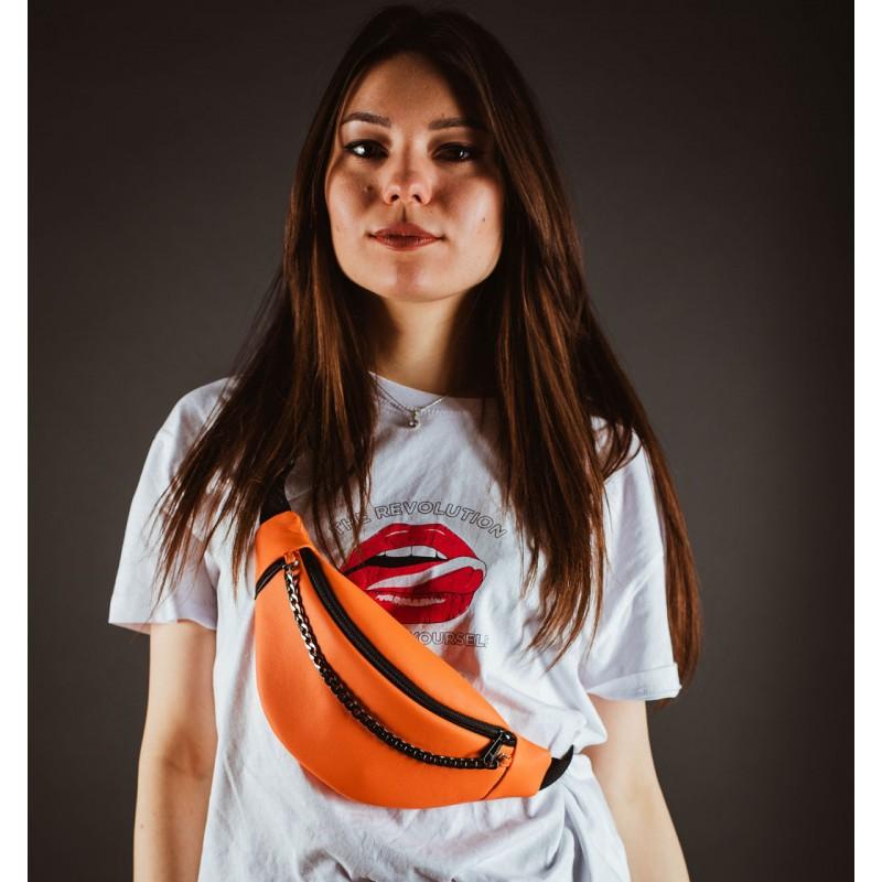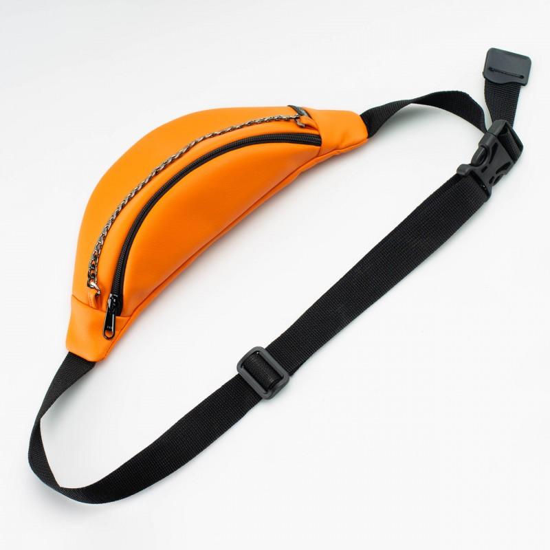 Поясна сумка-бананка помаранчева шкіряна з ланцюжком