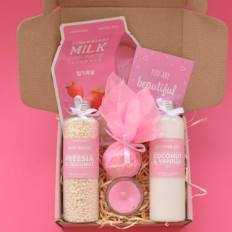 Мила коробочка, перев'язана красивою атласною стрічкою, відразу зацікавить дівчину. Розв'язавши стрічку і відкривши коробочку, всередині вона виявить намистинки для ванни з ароматом кокоса і кокосовий гель для душу, ароматизовану бомбочку для ванн і свічку. З таким набором кожне прийняття ванн перетвориться на свято, що дарує насолоду і гармонію. А після прийняття ванни зможе нанести на обличчя тканинну маску з ароматом полуниці, така маска зволожить шкіру обличчя і зробить її ще свіже.