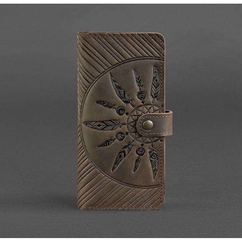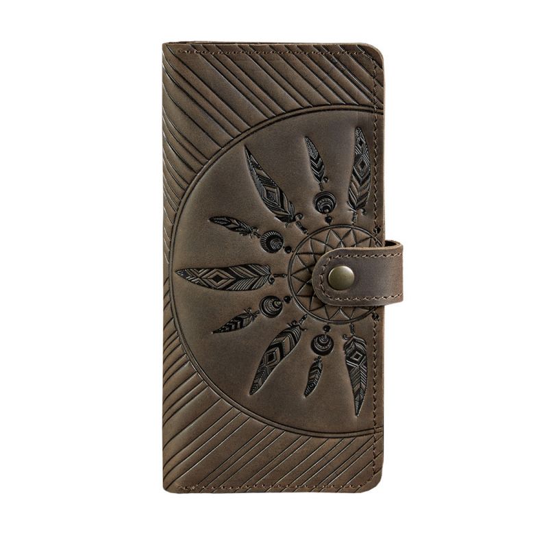 Прикрашений аксесуар тисненням у вигляді ловця снів. Ми впевнені, що цей індіанський талісман виконує не тільки декоративну функцію, але і захищає фінанси від швидкого витрачання і необдуманих витрат. Тиснення виконано чітко і акуратно. Вам сподобається тримати портмоне в руках!