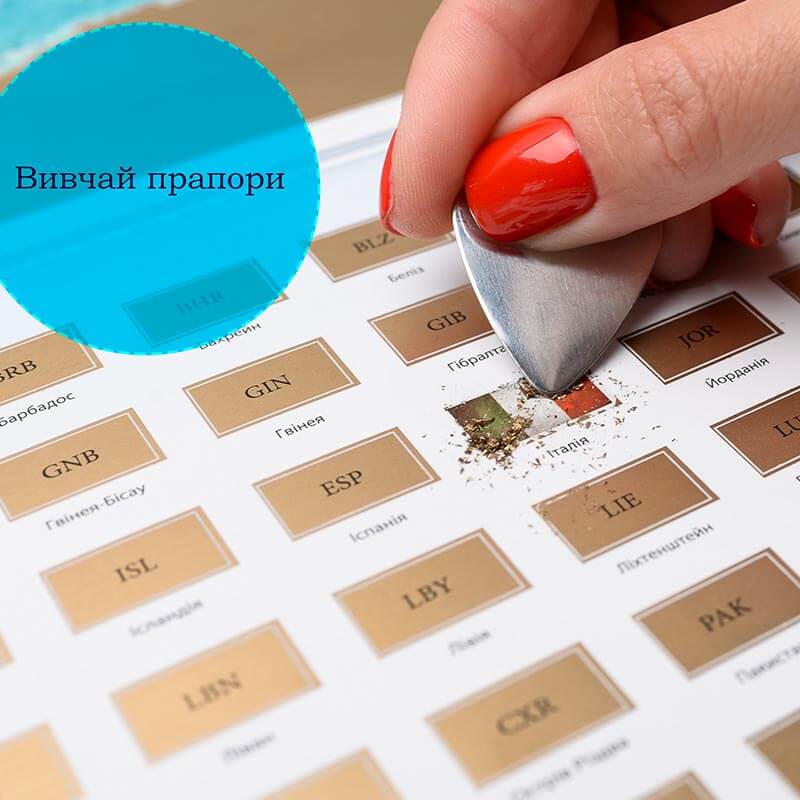 На карті окремо винесені більше 200 прапорів країн, які також покриті скретч шаром, їх можна стирати і вивчати.