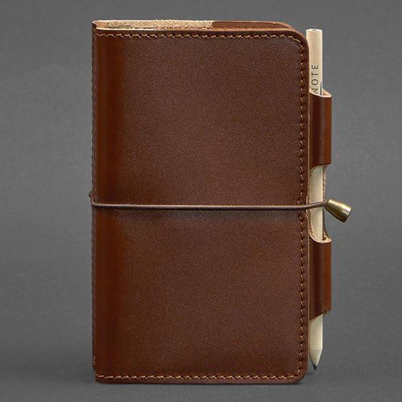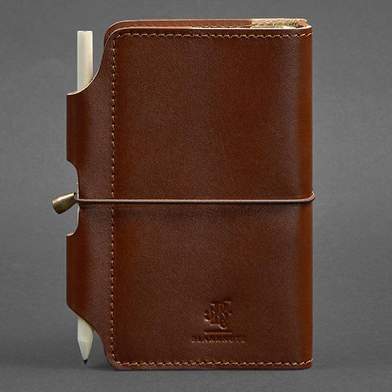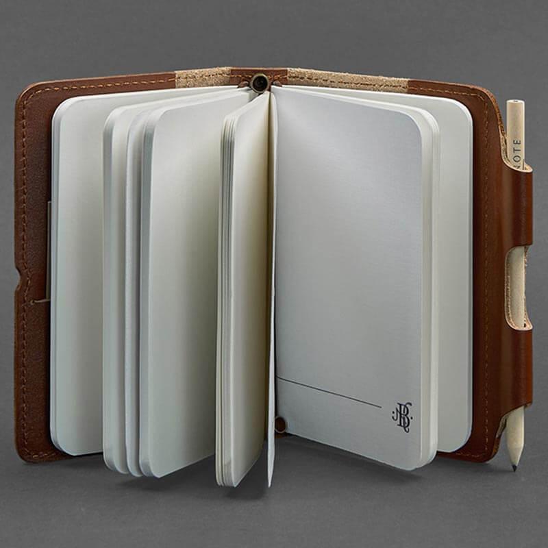Цей блокнот виконаний в цікавому форм-факторі: не класична книжкова палітурка, а, так званий "софт-бук", тобто прикріплені до цілісного шматка шкіри кілька зошитів. В якості обкладинки - високоякісна шкіра. Всередині - класичний блокнот, розділений на три знімні зошити. У кожному зошиті - по 40 аркушів. Ви самі можете вибрати колір паперу зошитів.
