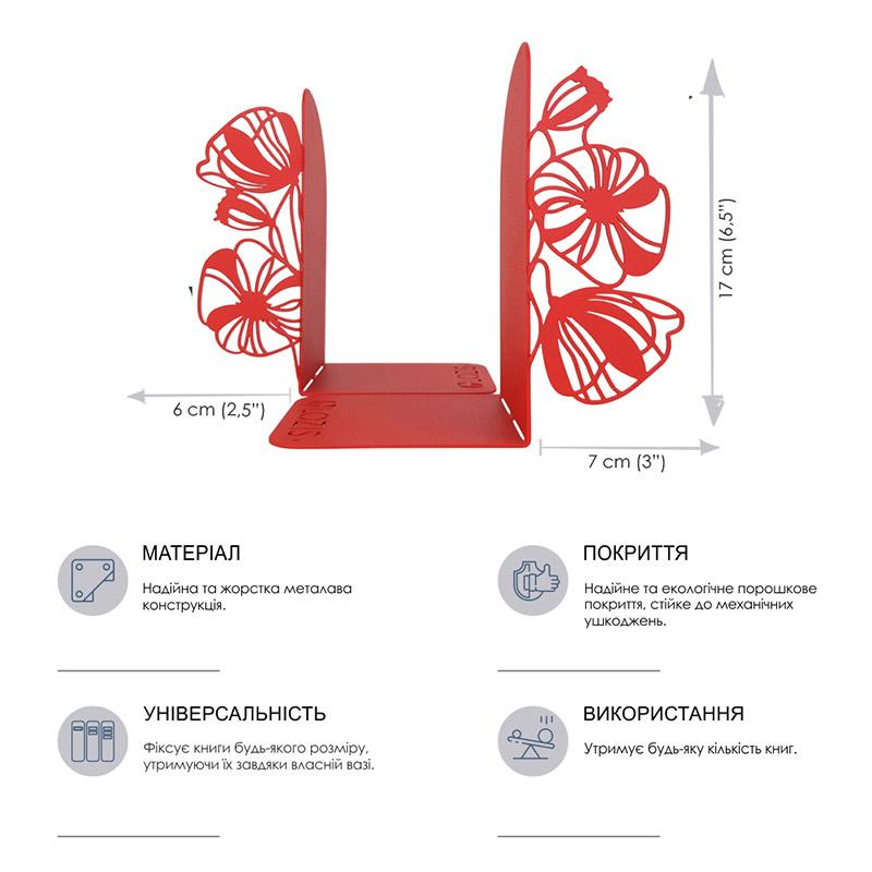 Комплект поставки включает в себя пару подставок для книг, что делает их идеальным выбором для тех, кто ценит порядок и стиль в своей коллекции книг. С упорами для книг Glozis Poppy, ваша библиотека будет не только организованной, но и преобразит ваше пространство в настоящий литературный уголок с характером и стилем.