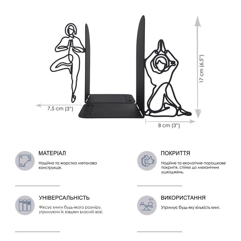 Комплект поставки включает в себя пару подставок для книг, что делает их идеальным выбором для тех, кто ценит порядок и стиль в своей коллекции книг. С упорами для книг Glozis Yoga, ваша библиотека будет не только организованной, но и преобразит ваше пространство в настоящий литературный уголок с характером и стилем.