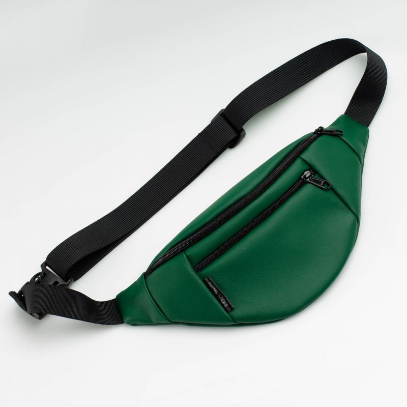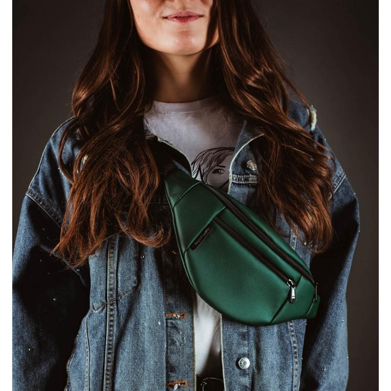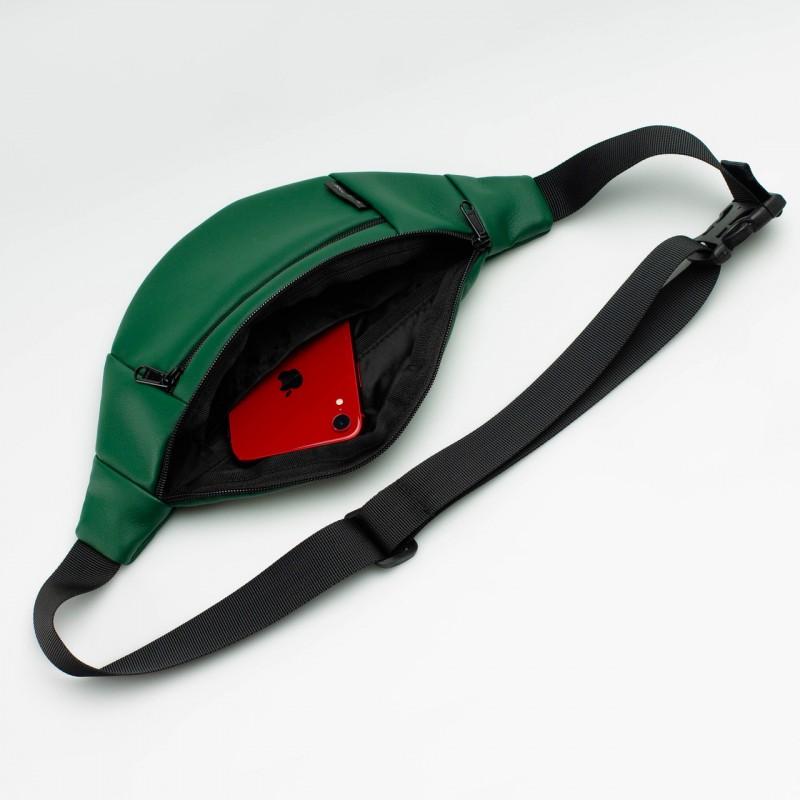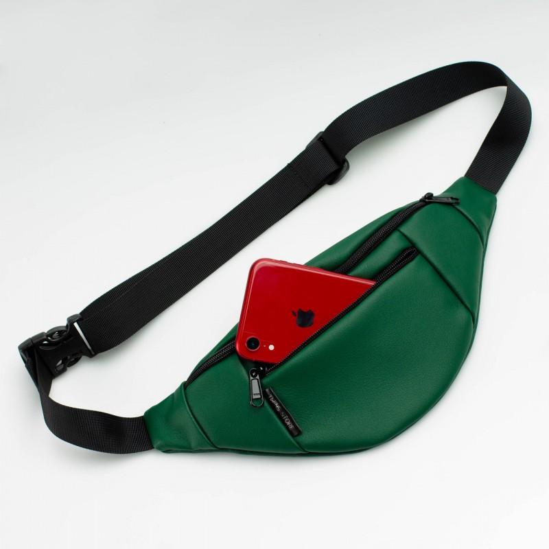 Поясная сумка-бананка зеленая кожаная